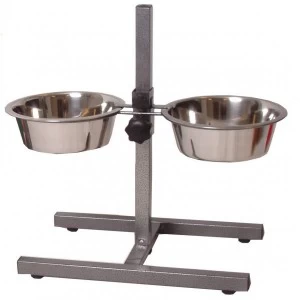 Voederstandaard inclusief 2 rvs bakken van 24cm. in hoogte verstelbare eet- en drinkbak voor iedere soort hond in elke levensfase. Door de bakken op gelijke hoogte van de maag te zetten neemt het “schrokken”af, dit kan maag- en darmklachten voorkomen. Door de bijgeleverde klem blijven de bakken op de plaats tijdens het gebruik. De bakken zijn eenvoudig te reinigen.
