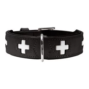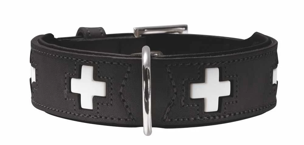 Hondenhalsband Swiss Zwart De klassieker bij uitstek van Hunter is deze beroemde halsband. De hondenhalsband is zeer vakkundig gemaakt van zacht rundleer. De halsband is gevoerd met zacht rundnappaleer voor extra comfort. De Zwitserse kruizen worden extra verstevigd in het leer genaaid. Kleur: zwart. Leverbaar in de volgende maten: Bepaal de juiste maat voor uw hond: