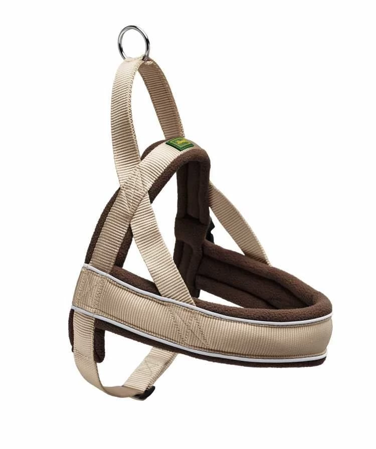 Hondenharnas Racing Beige Gebruik van een hondenharnas zoals het Racing harnas verdeelt de druk van de hondenriem beter over de romp van de hond dan een conventionele hondenhalsband. Deze betere verdeling van de druk zorgt voor extra comfort voor de hond. Het harnas heeft een traploos verstelbare buikriem zodat het harnas een goede pasvorm heeft voor de hond. De zachte voering van fleece rond de borst, de nek en de schouders van de hond is erg comfortabel voor de hond. De banden van duurzaam nylon en de fleecevoering maken het harnas ook zacht voor de vacht. Voor extra veiligheid heeft het harnas reflecterende strips op de banden, die de zichtbaarheid van uzelf en van uw hond in omstandigheden met weinig licht vergroten. Als het harnas vies is geworden, geen probleem: je kunt het harnas gewoon wassen. Dit harnas is bij uitstek geschikt voor sportieve activiteiten. Kleur : beige. Leverbaar in de volgende maten: Maat Breedte Borstomvang S 20 mm 42 – 53 cm M 25 mm 52 – 62 cm L 25 mm 62 – 75 cm XL 38 mm 72 – 90 cm XXL 38 mm 82 – 105 cm Bepaal de juiste maat voor uw hond: meten is weten