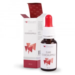 Maxani Zure oordruppels voor honden met gevoelige oren. Deze oordruppels zorgen voor een ongunstig klimaat voor ongewenste micro-organismen en reinigen de oren. De druppels zijn mild voor de oren en erg geschikt voor het gebruik bij zwemmende honden.
