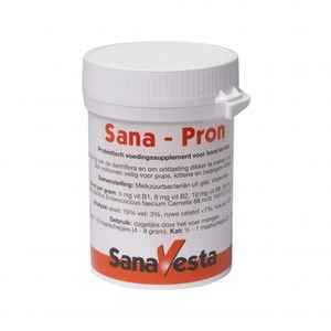 Sana-Pron is een probiotica met melkzuurbacteriën, vitamines B en C en elektrolyten. Sana-Pron geeft ondersteuning aan de darmflora en de spijsvertering van je hond of kat. Een gezonde darmflora en spijsvertering is essentieel voor een goede weerstand.