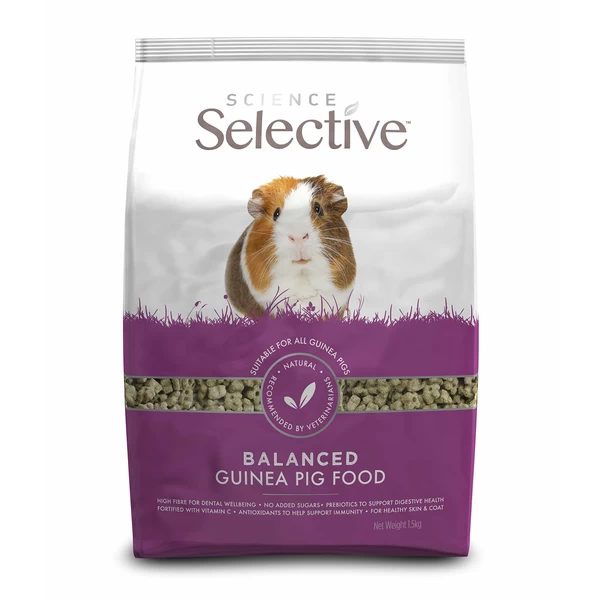 Supreme Science Selective Guinea Pig, is een complete en evenwichtige voeding voor cavia’s met paardenbloem, venkel en brandnetel. Deze kruiden bevordert de natuurlijke afvloeiing van vocht, stimuleert de spijsvertering en zorgt voor een goede blaas. Deze voeding bevat een essentiële dagelijkse behoefte Vitamine C, bevat een hoog vezelgehalte wat o.a. zorgt voor gebitslijtage, voorkomt selectief eten door de brok en er zijn geen suikers toegevoegd wat het gewicht op peil houdt.