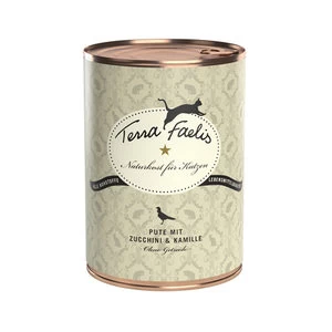 Terra Faelis – Kalkoen is graanvrije natvoeding voor katten. Terra Faelis bevat 90% kalkoenvlees. De overige 10% bestaat uit onder andere courgette, kattenkruid en kamille. De voeding bevat omega 3- en 6-vetzuren die bijdragen aan een gezonde huid en vacht.